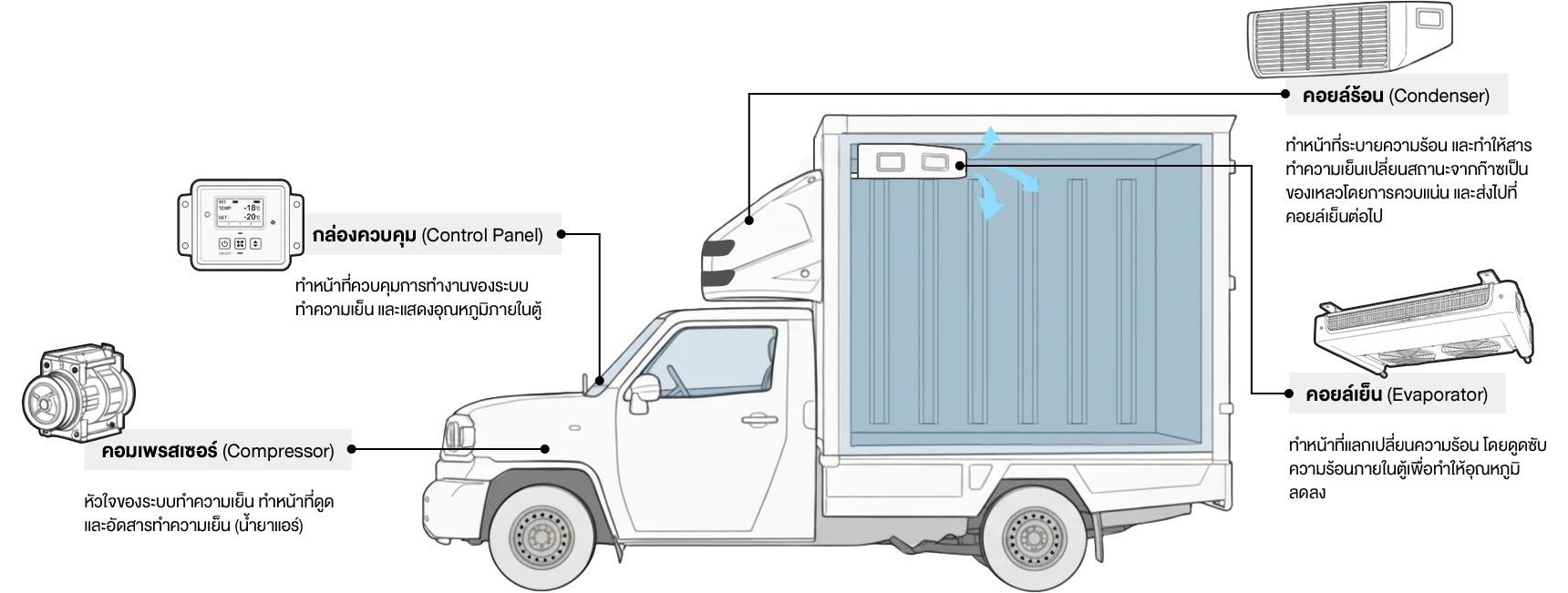 แต่ก่อนที่เราจะไปดูประเภทระบบทำความเย็น และการเลือกใช้งานอย่างเหมาะสม เพื่อให้รถห้องเย็นของเรามีประสิทธิภาพมากที่สุด เรามาทำความรู้จักองค์ประกอบเบื้องต้นของรถกระบะห้องเย็นกัน