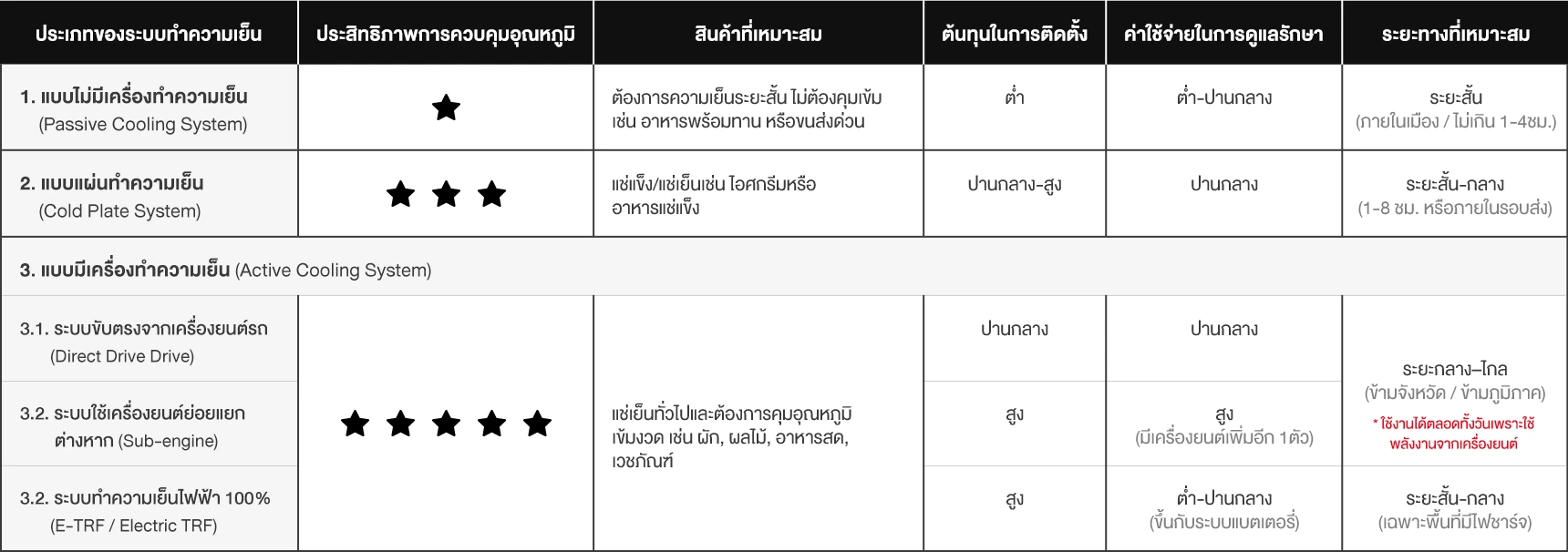หลังจากที่เรารวบรวมข้อมูลมาให้ท่าน เราสามารถแบ่งระบบทำความเย็นในรถห้องเย็นออกเป็น 3 ประเภทหลักๆ ดังนี้